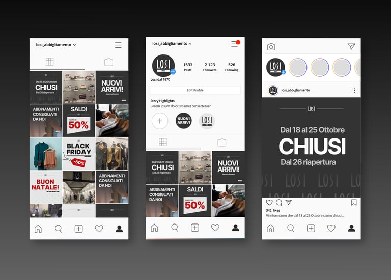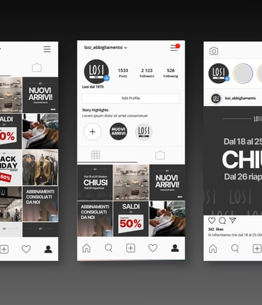 Creazione di grafiche social per il negozio di abbigliamento Losi, consulenza strategia social, digitalizzazione del logo, creazione palette e positivo/negativo del logo.
